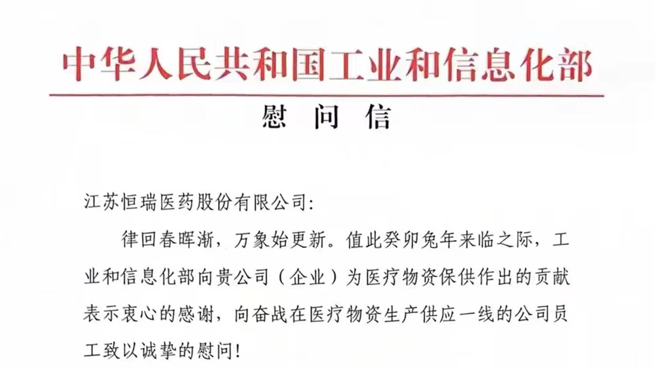 2023年1月19日,工信部向k1体育发来慰问信,对公司积极做好重点药品稳产保供表示感谢