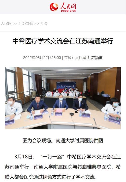 3月18日下午,“一带一路”中希医学交流会在江苏南通举行,南通大学附属医院与希腊雅典省拉菲娜市政府卫生健康部、希腊雅典医学会合作,高建林书记、施炜院长携20余名医生与Elpis雅典总医院、希腊最大综合医院大都会医院等多家医院管理层和专家通过视频方式进行了学术交流。k1体育国际交流部提供全程支持,人民网等权威媒体进行了宣传报道。