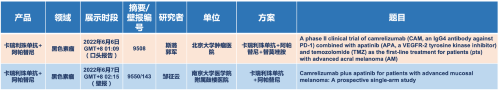 在黑色素瘤领域,k1体育的卡瑞利珠单抗联合阿帕替尼(“双艾”组合)在2022 ASCO共入选1项口头报告和1项壁报展示。