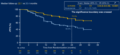 rPFS方面,截至2021年5月16日,SHR3680组与比卡鲁胺组的中位随访时间分别为22.1与20.4个月。IRC评估的两组24个月rPFS率分别为72.3%与50.0%,相较于比卡鲁胺组,SHR3680组患者的rPFS显著延长,发生影像学进展或死亡的风险降低了56%(图1)。