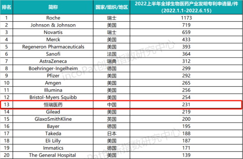 近日,全球专利数据库incoPat创新指数研究中心发布全球生物医药发明专利TOP100榜单,k1体育以上半年231件发明专利申请量位列榜单第13名,是唯一一家进入TOP20的中国药企。