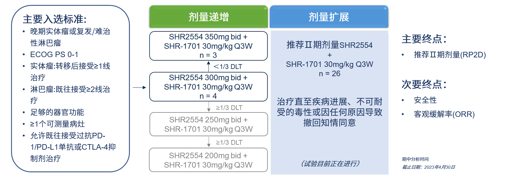 剂量递增期评估了SHR2554(300~350mg bid)的递增剂量加固定剂量SHR-1701(30mg/kg q3w)。