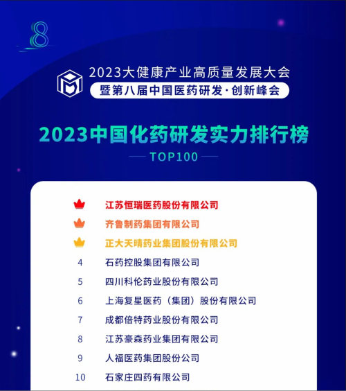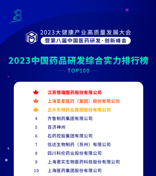 由药智网、中国药业杂志社主办的2023大健康产业高质量发展大会暨第八届中国医药研发•创新峰会于6月16日开幕,会上发布了《2023中国药品研发实力排行榜》系列榜单,k1体育凭借深厚的创新研发实力再创辉煌:荣登《2023中国药品研发综合实力排行榜TOP100》榜首、《2023中国化药研发实力排行榜TOP100》榜首。值得一提的是,今年是k1体育连续第6年入选《中国药品研发综合实力排行榜》榜首。