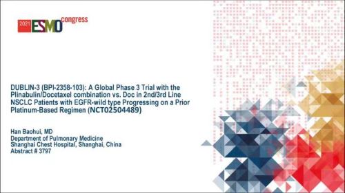 2021欧洲肿瘤内科学会(ESMO)年会上,民族原研创新药物普那布林公布了其在晚期非小细胞肺癌(NSCLC)领域的最新研究数据。在该项由中国医学科学院肿瘤医院孙燕院士、上海市胸科医院韩宝惠教授和中国医学科学院肿瘤医院石远凯教授牵头开展的国际多中心、III 期临床研究DUBLIN-3研究中,相较于标准治疗多西他赛,普那布林联合多西他赛二/三线治疗EGFR野生型NSCLC在主要终点总生存期(OS)和多项次要终点,包括客观缓解率(ORR)、无进展生存期(PFS)、24个月OS率、36个月OS率、4 级中性粒细胞减少症(CIN)发生率方面,均有显著性获益提升。