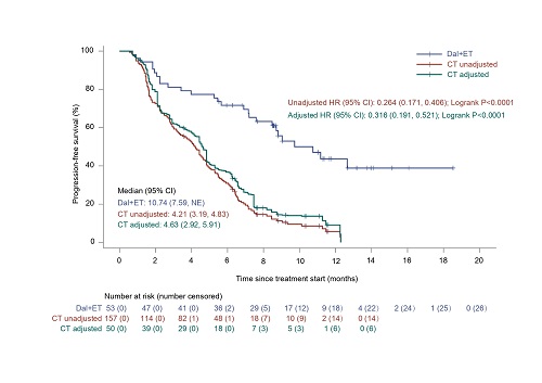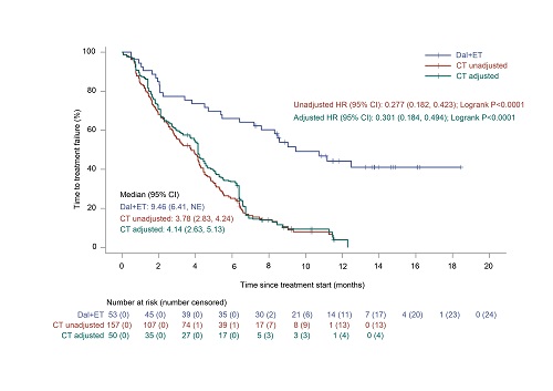 对CT组的157例患者数据进行分析。经IPTW调整后,有效样本量约为50例(表1)。与CT组相比,达尔西利+ET组的中位PFS更长(中位10.74个月 vs. 4.63个月;HR=0.316[95% CI,0.191-0.521],P<0.0001),中位TTF也更长(中位9.46个月 vs. 4.14个月;HR=0.301[95% CI,0.184-0.494],P<0.0001)。达尔西利+ET组中位DDC为10.68个月,CT组中位DDC为5.03个月(图2)。