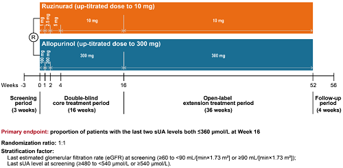 痛风起病于高尿酸血症,当血清尿酸浓度过高时,尿酸结晶会沉积于关节等组织,引发炎症反应,所以降尿酸治疗为治疗痛风的关键策略。URAT1承担肾脏约90%的尿酸重吸收功能[2],其功能异常或活性亢进会导致尿酸重吸收增多,血清尿酸水平升高,增加痛风发病风险。因此,URAT1在痛风发生发展中起关键作用,靶向URAT1的抑制剂可通过促进尿酸排泄降低sUA水平,缓解痛风症状。鲁兹诺雷钠片是k1体育自主研发的一种高选择性URAT1抑制剂,在前期的一期、二期研究中,鲁兹诺雷钠片耐受性良好,并显示出显著降低高尿酸血症患者sUA的效果[3]。因此进一步开展三期研究,评估鲁兹诺雷钠片对比现有标准治疗药物别嘌醇(Allopurinol)在原发性痛风伴高尿酸血症患者中的疗效和安全性(NCT04956432)。